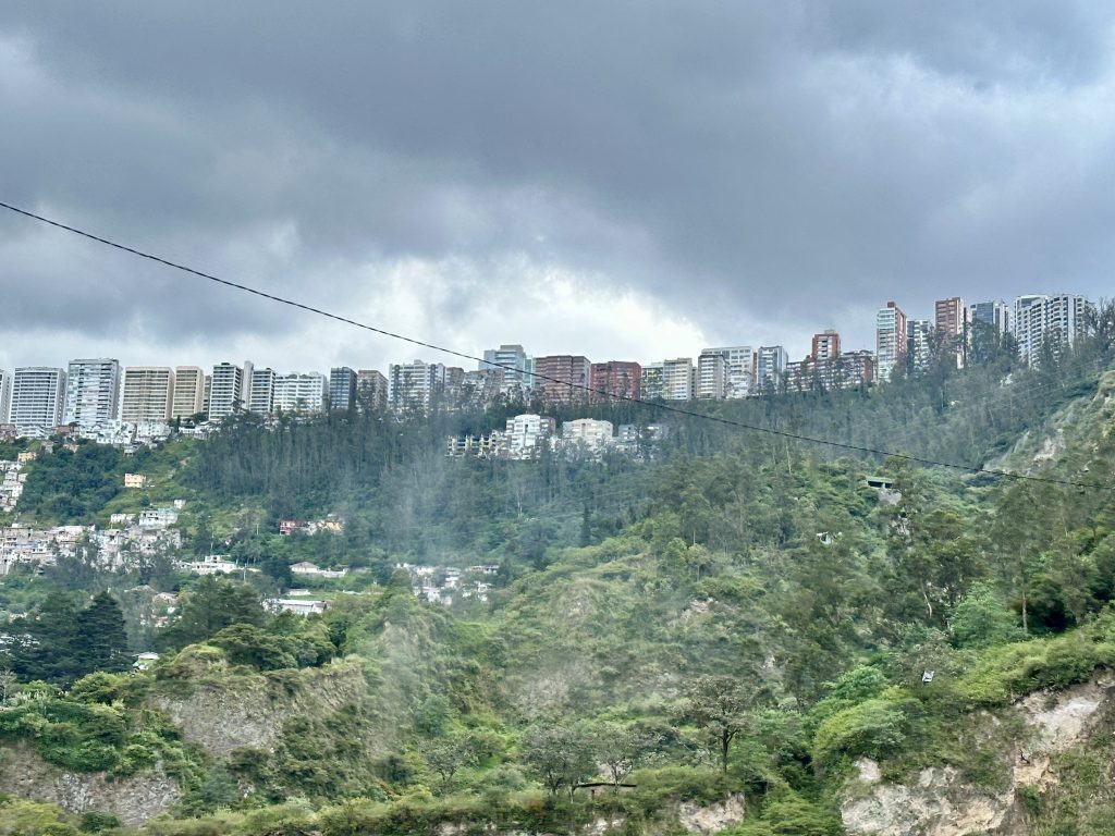 The airport is about 45 minutes from Quito and it is located in the valley below the city so the entire drive is up a steep incline. As you approach the city the skyscrapers in central Quito appear above the ridgeline. All along the way there are homes built right into the side of these steep cliffs with seemingly little support affixing them to the mountain. A key trait of South American cities is the street vendors selling their wares to passing cars (we even saw multiple people selling ice cream cones on the side of the highway).
