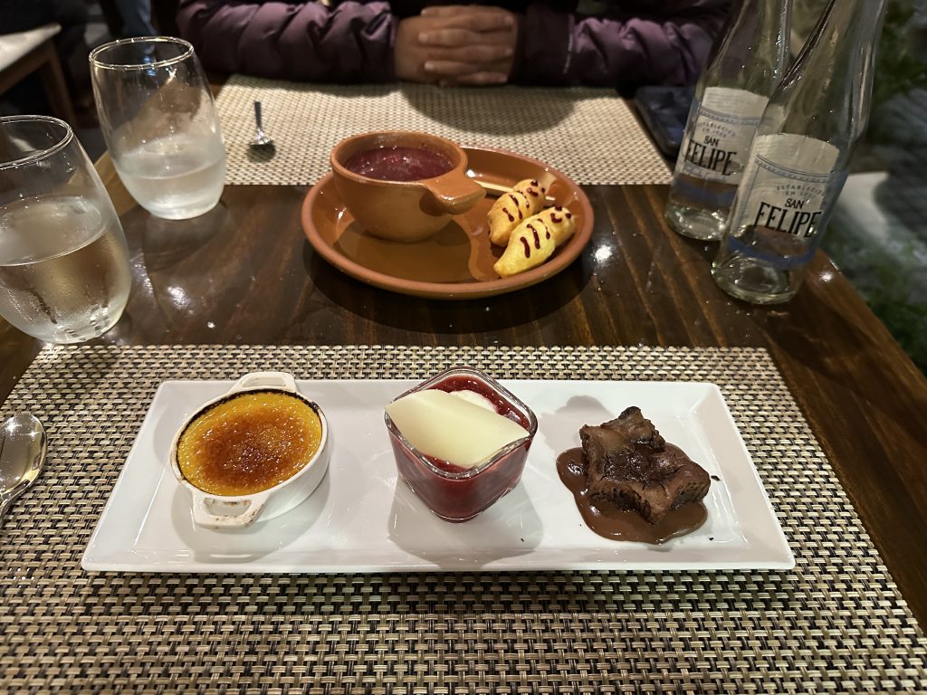 We had a lovely traditional Ecuadorian dinner at Achiote complete with empanadas, lamb stew, the famous local delicacy (which of course we had to try) Guinea Pig, and an array of dessert samplers. The restaurant had a 65 year old magnolia tree in the middle of it and a live guitar player. Per Ecuadorian law, the sale of alcohol is not permitted today because it is election day in Ecuador; which the restaurant apparently took “very seriously” by enforcing it by simply serving alcohol in the standard water glasses instead of the alcohol specific glasses. That didn’t quite jive with Stephanie’s legal analysis brain, but we enjoyed our wine and beer nonetheless!