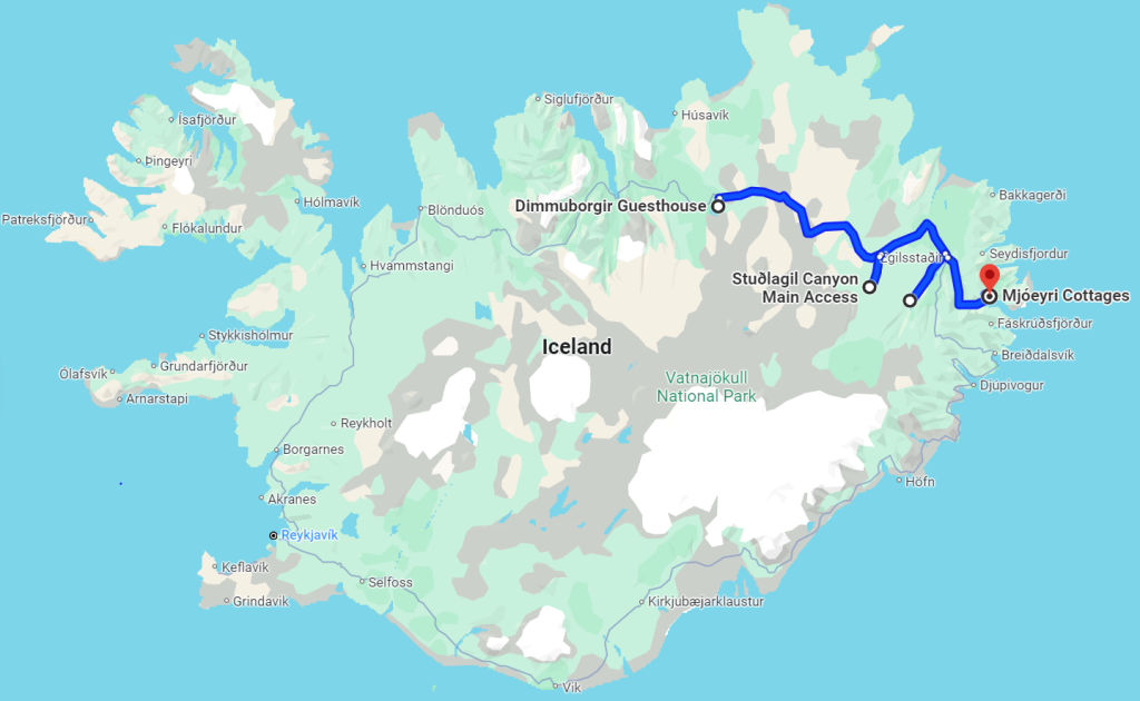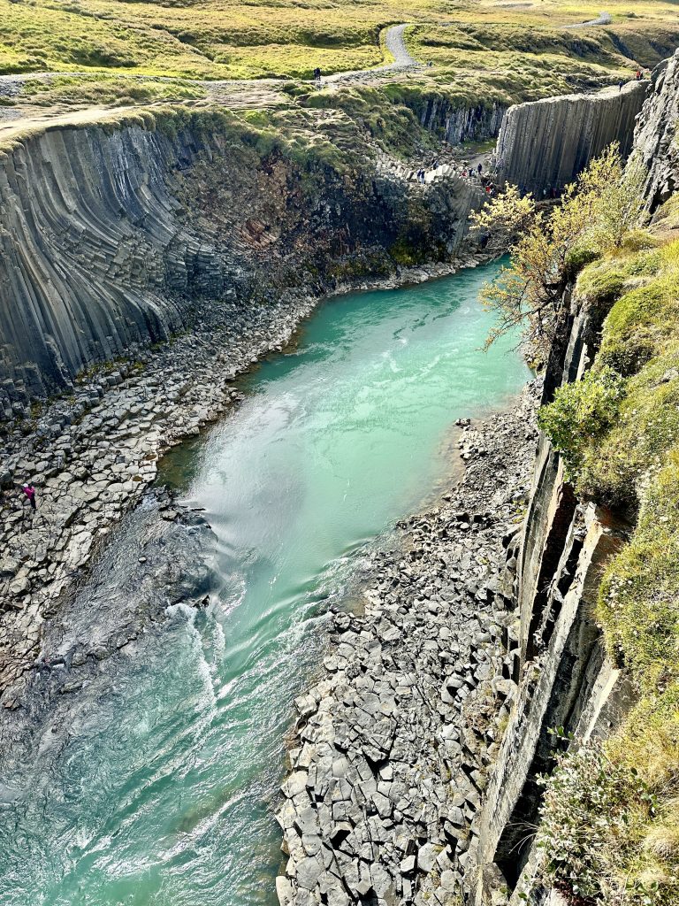 Our first stop was Stuðlagil Canyon. The Canyon walls are largely basalt deposits that form unique tower structures and striations. There used to be a significant river running through the Canyon; however, since it was dammed upstream the river has reduced in size. The milky blue/green color of the water mixed with the unique geological formations make for a beautiful setting.