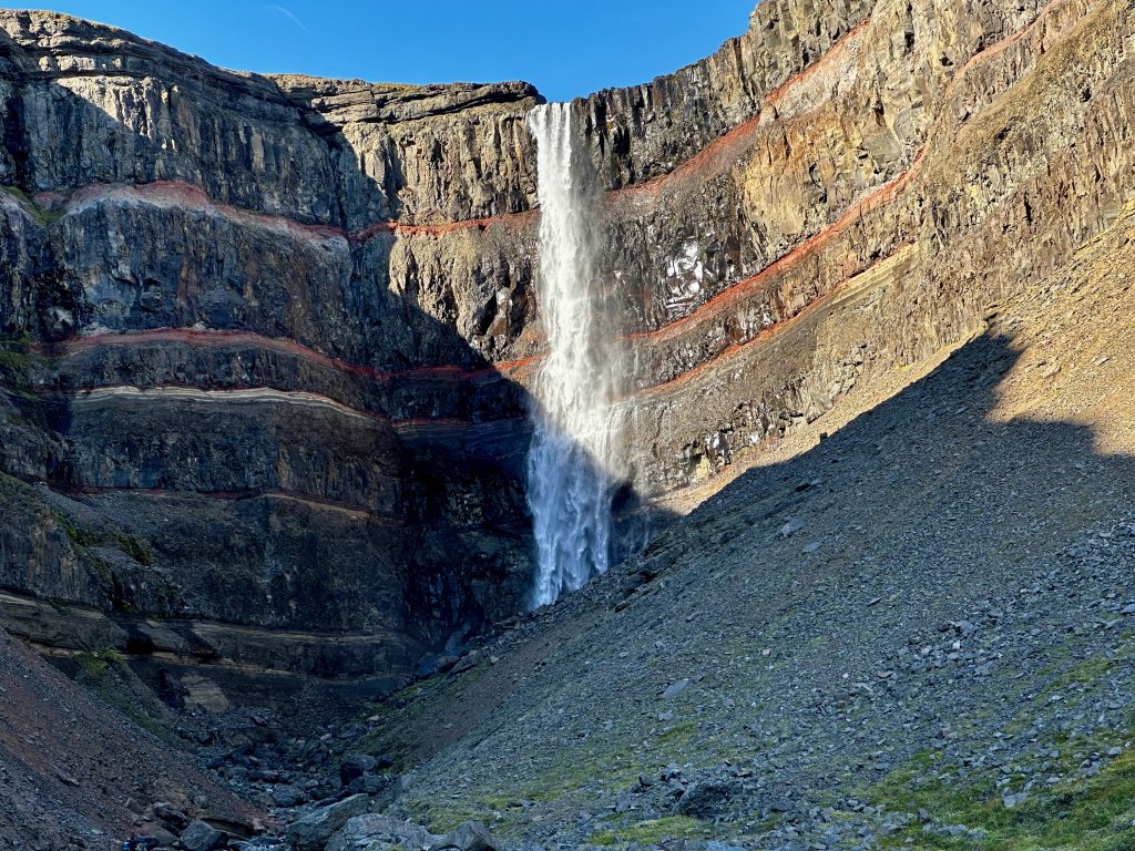 As we drove further east we caught our first glimpse of forest land in Iceland – a terrain we were not expecting to see due to the high winds we have experienced. The trees are small and the growing season is short. We had our exercise of the day at Litlanesfoss, a two mile hike with an elevation gain of over 1,000 feet to picturesque views of the surrounding farmland and distant glaciers and a tall waterfall. As we were ascending we certainly got an appreciation for all the work the sheep do climbing the surrounding hills!