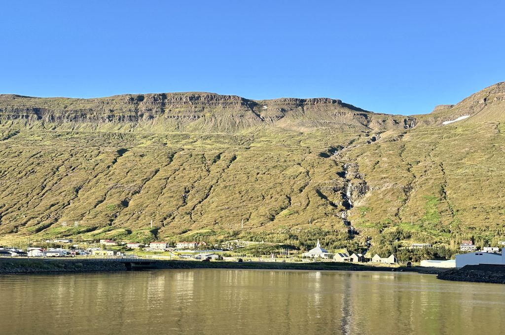 We ended our drive today by reaching Reyðarfjörður fjord, the longest and widest fjord in east Iceland, and eventually the small fishing town of Eskifjörður. The town sits in a cove that is protected from the winds. In the early 1900s, the town boomed with herring houses, one of which is now a restaurant that we ate at for dinner. The inside of the restaurant was still decorated with all of the old tools and remnants of the herring house and we were even able to catch a glimpse of the hard life of a worker upstairs from the restaurant where the bunkhouses were still in exactly the same state as they were when the herring house was abandoned when there were no longer herring in the fjord in the 1930s. We finally were able to try two classic Icelandic traditions – shark and Happy Marriage Cake – both of which were good (to our surprise as for the shark).