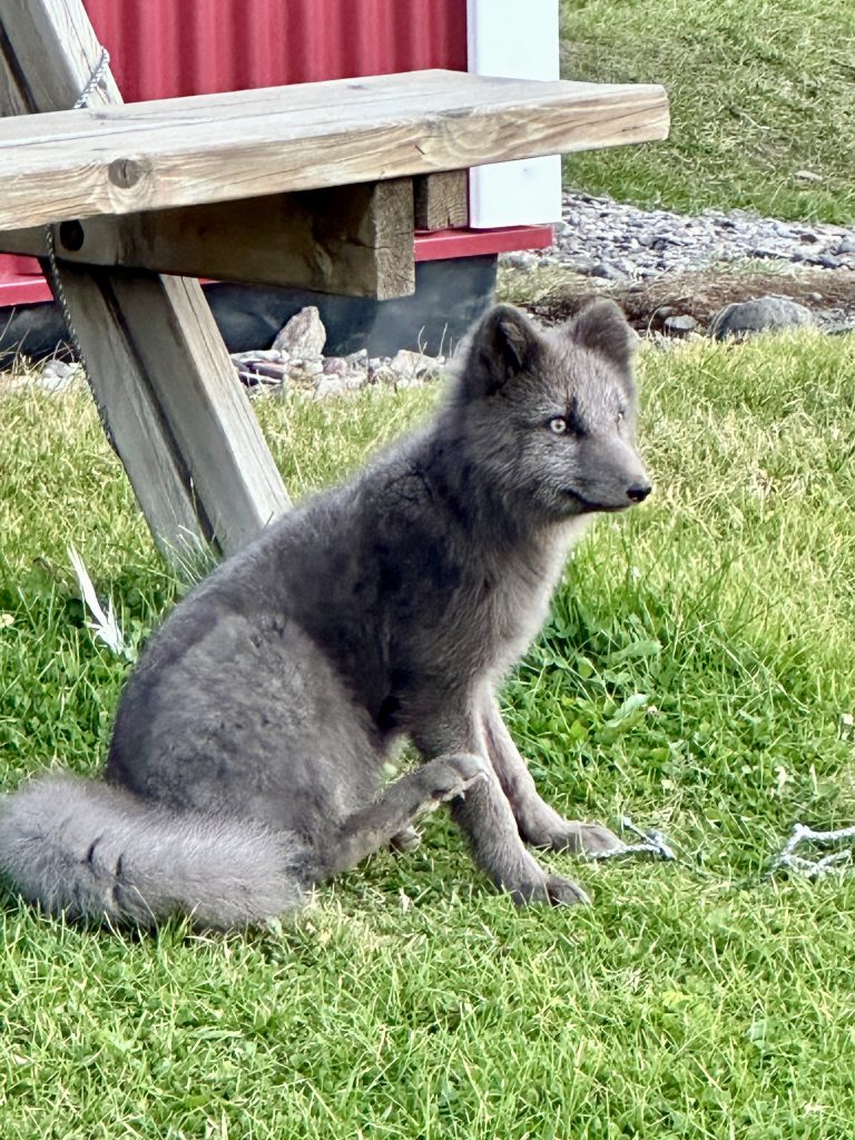 Tonight we are spending the night at cute little cottages on the banks of the fjord. As we walked the grounds, we came across an arctic fox, a rare sight in this part of Iceland. No larger than 30 pounds, the small fox was rescued a few years ago by the owners of the cottages and is friendly with all the guests. Tomorrow we have our busiest day of our trip – a 7 hour drive with many stops along the way.