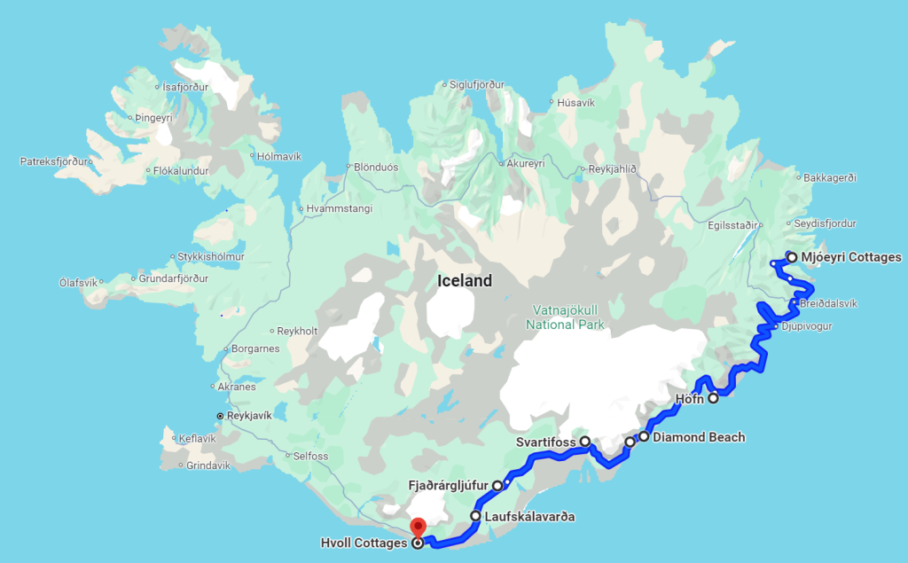 This morning we set off on the longest driving day of our trip as we made our way down the entirety of the Eastern Seaboard. By the end of the day we covered about 340 miles of primarily winding roads along some of Iceland’s largest fjords. Due to this circuitous route along the coastline the total drive time was over 7 hours. Since we also planned numerous stops along the way we needed to get on the road early to maximize the daylight hours (this meant a lighter breakfast on the road for Jay). We were treated to ideal weather throughout the day so the natural beauty of Iceland was on full display.