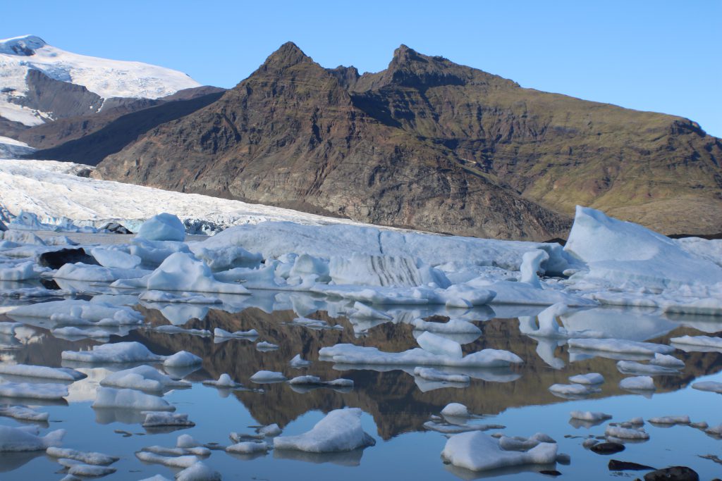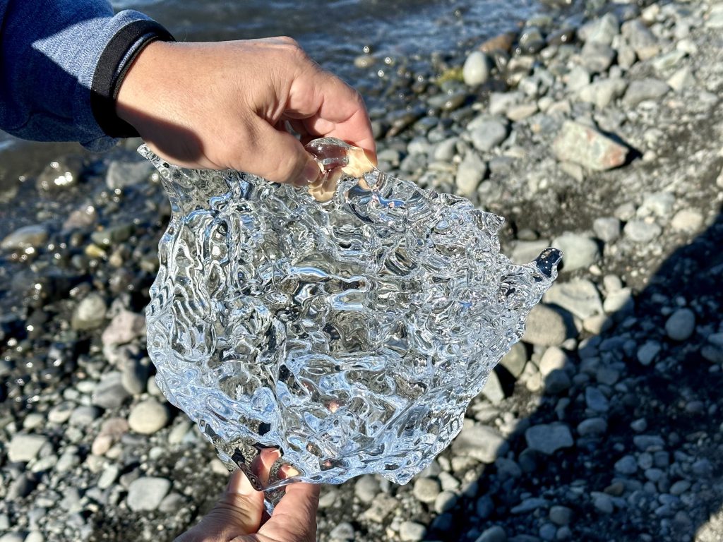 Diamond Beach is found at the end of the Jökulsárlón glacial lagoon and is so named because as chunks of the glacier break off and slowly melt in the lagoon small pieces on their way to the ocean end up on the beach. The crystal clear ice that rests of the black sand beach reflects the sunlight in way that mimics the aforementioned gemstone. On the edge of the lake we were within a 100 feet of large glaciers slowly melting away. Close enough in fact that the air was noticeably cooler as the breeze passed over the sea of ice. While on the beach we stood beside the small chunks of ice and observed the purity of the water contained within.