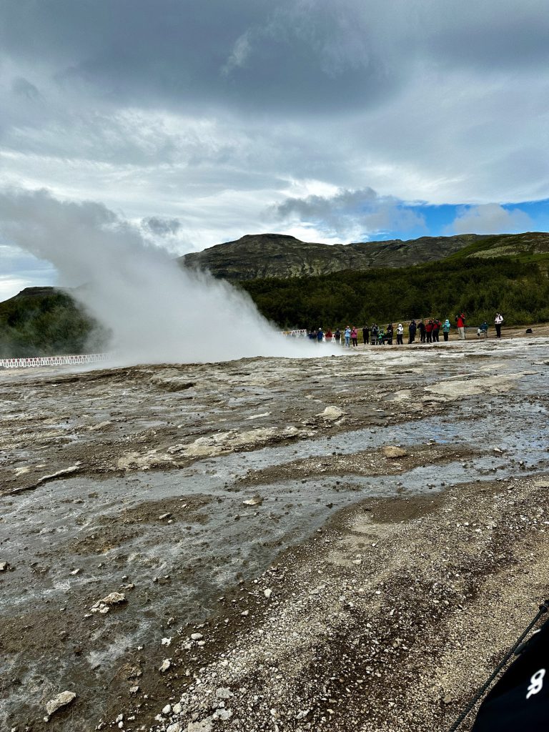 Following Gullfoss we headed to a series of geysers which can be thought of as this island’s version of Old Faithful. The geyser Strokkur erupts every 4 – 10 minutes on average and can reach heights of up to 140 feet. We saw Strokkur blow during our visit but the height we witnessed while much shorter (around 30 feet) was still a fun experience. As we have neared the capital again the number of visitors at each of these sites has grown exponentially from what we saw up north. In addition, each major site is accompanied by large lavish hotels and gift shops. Gone were the parks with gravel lots and the occasional restroom which we had grown so accustomed to during the majority of our trip.