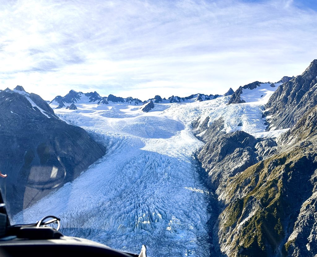 Eddie, our seasoned pilot, took us on an aerial tour which started with the Franz Josef and Fox Glaciers and then moved across the continental divide before heading to our landing site on the Shackleton Glacier. Along the way we had exceptional views of Mount Cook, Mount Tasman and all of the other striking peaks of the Mount Cook National Park. After landing on the Shackleton Glacier we were able to walk around and take in the majesty of the icy wonderland we found ourselves on.
