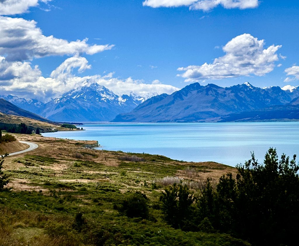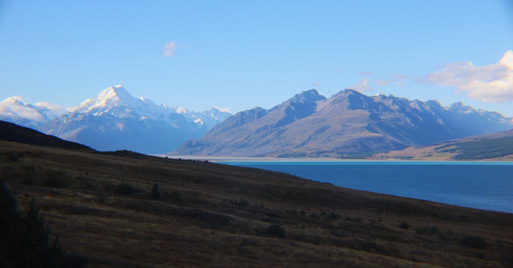 With an imminent storm approaching, we decided to bypass checking into our rental house first and continue our drive up to the Mount Cook area (known as Aoraki to the Maori). Winding along the crystal blue waters of Lake Pukaki, we were treated to stunning views of the Southern Alps.