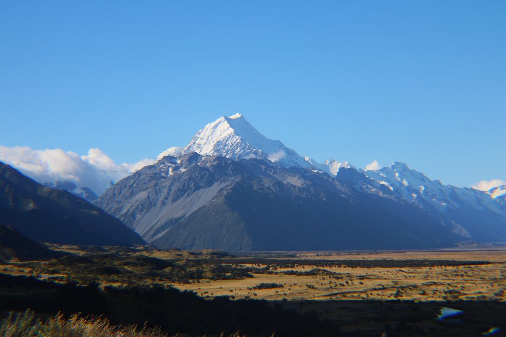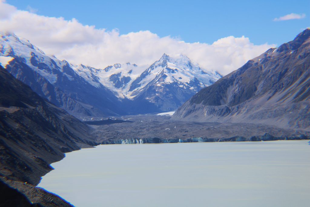 We took another short hike in the Mount Cook area to a swing bridge with a lookout of Mueller Lake and a closer view of some of the Southern Alps. Throughout the afternoon there were puffy white clouds around the mountains while the sun shined through, representing a very good day in the mountains. As we were leaving, we were treated to a very rare occurrence in which the clouds almost completely dissipated and Mount Cook prominently displayed itself. Against the colorful waters and surrounding sharp peaks, these views are some of the best that New Zealand has to offer.